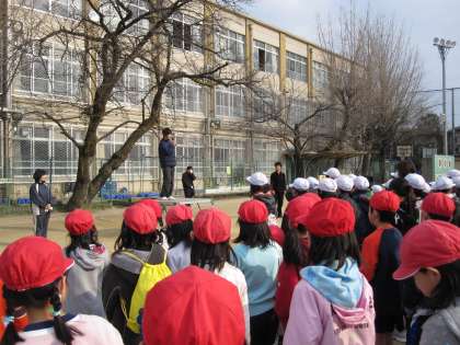 学校で校長先生のお話を聞き,児童会代表があいさつし出発です。