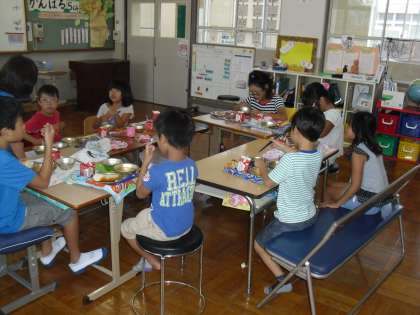 1年生との給食交流が始まりました。5組の教室で円くなっていろいろな話をしながら給食をいただきました。5組の子どもたちと1年生が,どんどん仲良くなってほしいと思います。