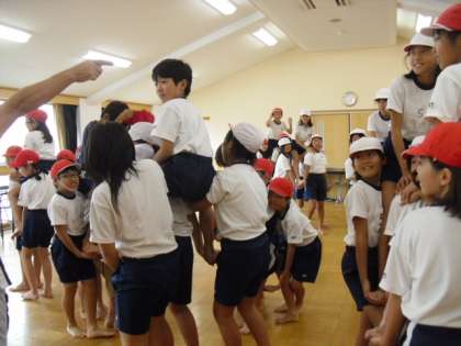 騎馬戦の練習が始まっています。まだまだ騎馬を組むのに慣れない様子です。