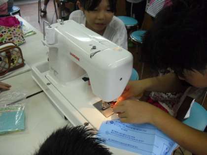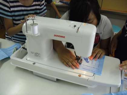 家庭科の学習でミシン縫いをしています。慣れないミシンですが,みんな楽しんで縫っていました。