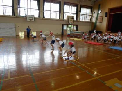 マットで前転、フラフープで3回縄跳びのようにジャンプ、最後は平均台を渡ってダッシュです。