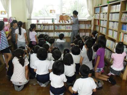 中間休みの図書館には,低学年と中学年の子どもを中心に多くの子が集まりました。本は「Brown Bear,Brown Bear,What Do You See?」です。