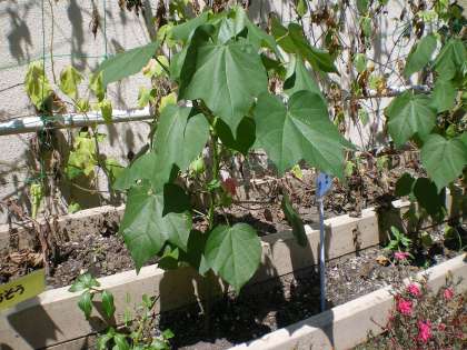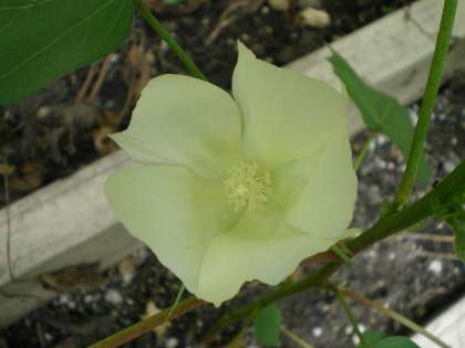 この花は,「ワタ」の花です。そう,私たちが身につける衣服や家庭にある綿製品のもとになるあの「ワタ」の花なのです。