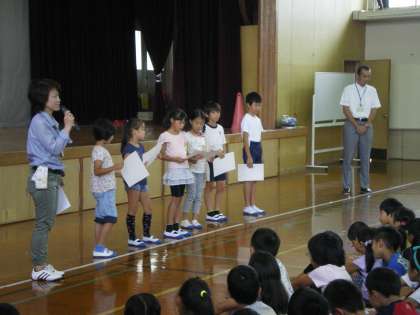 その後,絵画展や硬筆書写作品展で受賞した子どもたちの表彰式を行いました。受賞作品を紹介すると「わー、すごーい!」「上手やな。」とあちらこちらから声が上がりました。前に並んだ子どもたちのちょっぴり恥ずかしそうで,でも誇らしげな顔がとても印象的でした。ポカポカした温かな時間でした。