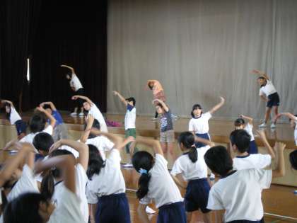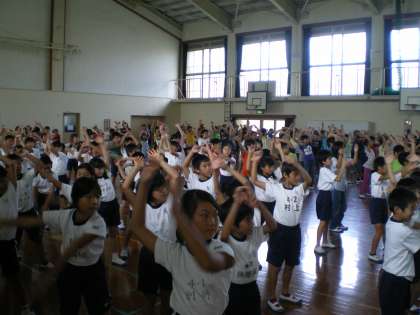 今日の中間休みから運動会の全校ダンスの練習も始まりました。今日は,4年生以上の子どもたちの練習の日です。前に並んだダンス係の模範演技を見ながら,音楽に合わせて楽しく練習をしました。