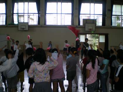 中間休みに,各学年の赤組の子どもたちが体育館に集まりました。赤組も白組に負けないくらいみんな集中して練習に参加していました。