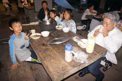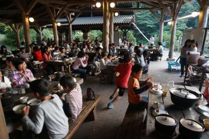 食べる時もみんなで協力し、どの班もほとんど残さず食べきっていました。お世話になる桂東少年補導委員会の皆さんと同志社大学ワーキングコーラスの皆さんとも一緒に食べました。