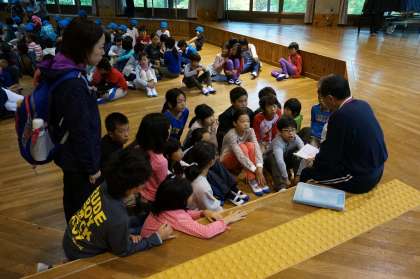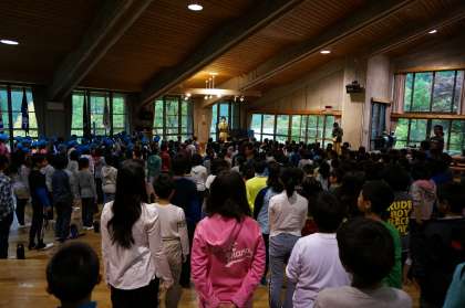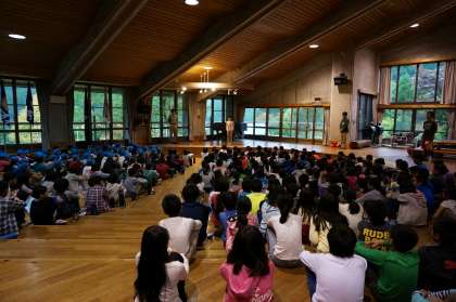 朝の挨拶と山の家の先生のお話のあと、それぞれの学校の代表が「学校紹介」をしました。どの子もしっかり練習をしてきた様子がわかる堂々とした学校紹介でした。すれ違う時もしっかり挨拶できる学校が多くお互いに良い刺激になります。