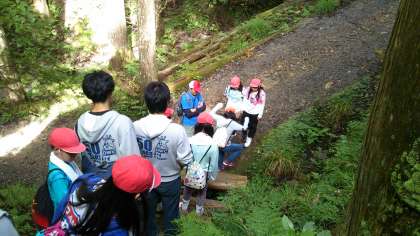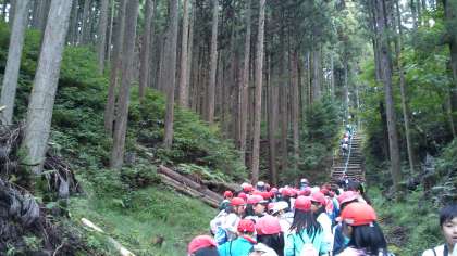 大きな杉がたくさんある森を抜け、長い階段を登り、コウモリや虫、たくさんの生き物にも出会えました!