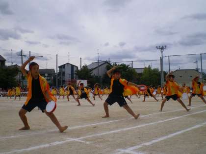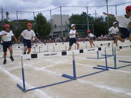 6年生【障害物走 50mハードル】・4年生【団体演技 心を一つに「あしびなー」】