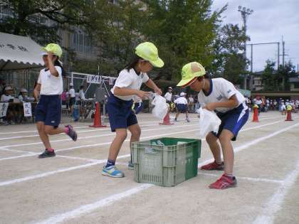 いつもグリーンスクールの時に地域の方や教職員がかぶる黄色の帽子をかぶって,ペットボトルをレジ袋に詰めて・・・。日頃の環境に対する意識がレースの勝敗を左右する展開になったでしょうか??