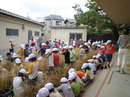 バケツ稲の稲刈りをしました。はじめて,鎌を使ってのドキドキしながらの刈り取りとなりました。