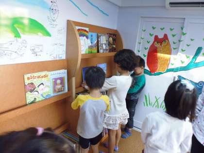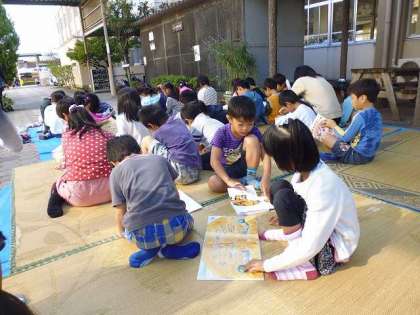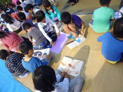 今日はキャラバンカーに来ていただいて,たくさんの本の中から好きな本を選んで読ませていただきました。550冊の本がのった大きな車が,とても楽しい絵本箱のようでした。選んだ本はゴザをひいた屋外で読みました。外の風を感じながら楽しい本に触れ,とても心豊かな時間を過ごすことができました。