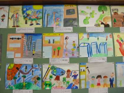 教室では,先日仕上がったお話の絵を掲示しています。2つのお話の中から子どもたちが選び,お話を聞き,絵にしました。個性豊かな作品がたくさんそろいました。