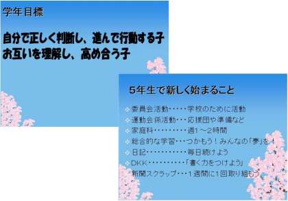 担任の紹介や,学年目標,5年生から新しく始まることなどを