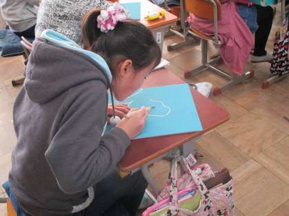 版画で彫刻刀でのほりをしています。みんな上手にほることができました。