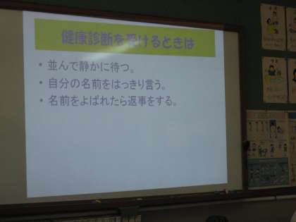 最初に,養護教諭の方から保健室の使い方について説明があり,