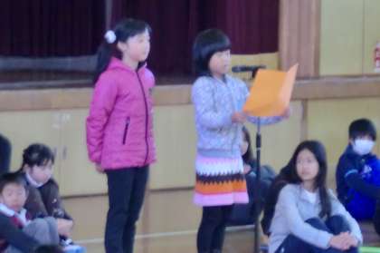 3年生の代表の子は,11月に地域の方と交流し,頂いた手縫いのおじゃみと雑巾を通して考えた事や思った事を発表していました。