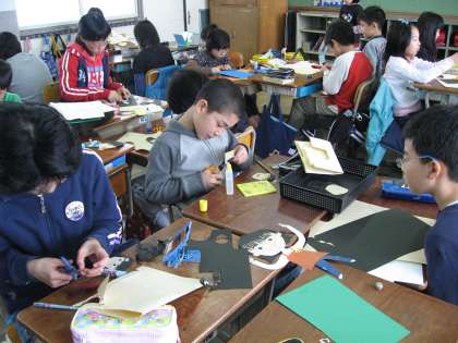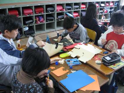 5年生は今,図工の時間に自分たちの顔を画用紙を思い思いの形に切って