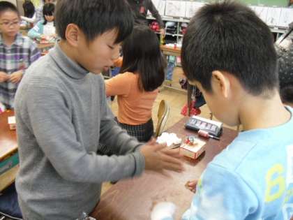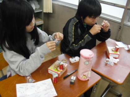 自分たちで電磁石を作ろうと導線を巻きつけて,コイルを作りました。巻くだけで精一杯でした。みんな1回,2回,3回...と数えながら100回巻きコイルを作っていました。