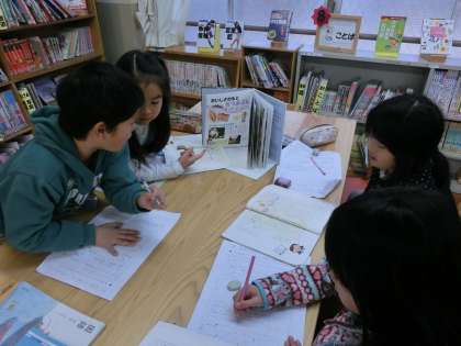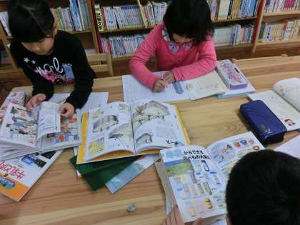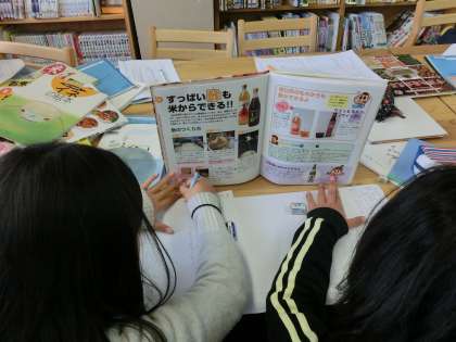 「すがたをかえる大豆」の単元を学習したので,他の食品でもすがたをかえているものがないか,図書室の本を使って調べています。