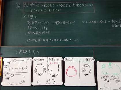 理科の学習で,「電磁石の力を強くするには」について話し合いました。