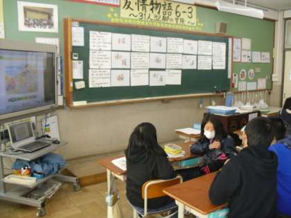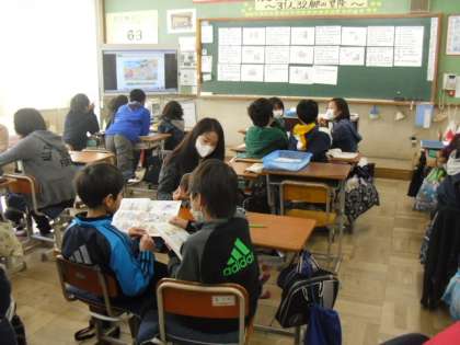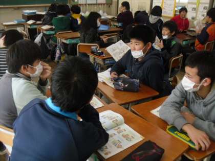 ただいま6年生はレッスン7を学習しています。昔話の「ももたろう」を英語で発音し,役になってグループで練習しています。