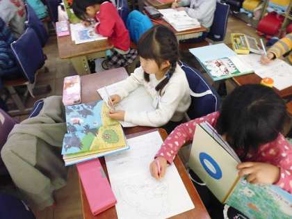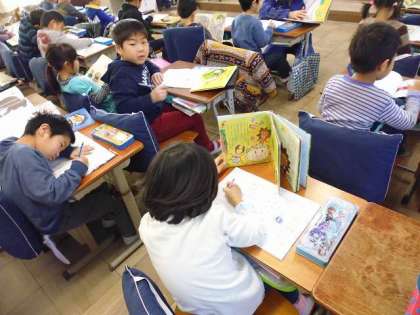 お気に入りの本を友だちに紹介するカードを作ります。みんなのカードをつなげてお話列車を作ります。どんな本を紹介するか,選ぶのも楽しいですね。