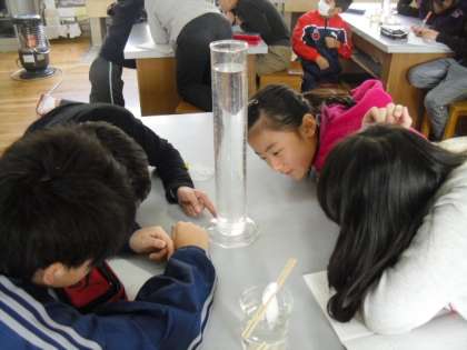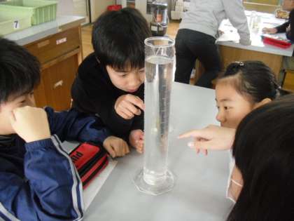 溶ける瞬間はどうなっているのでしょう。みんな食塩を入れた瞬間から目を離さず観察していました。