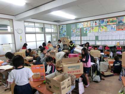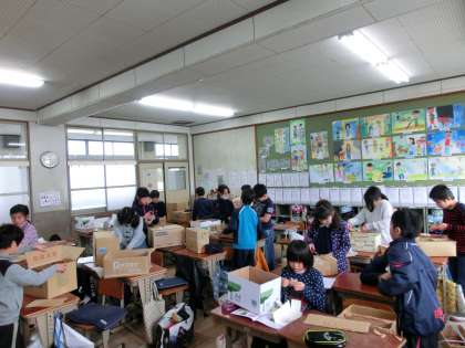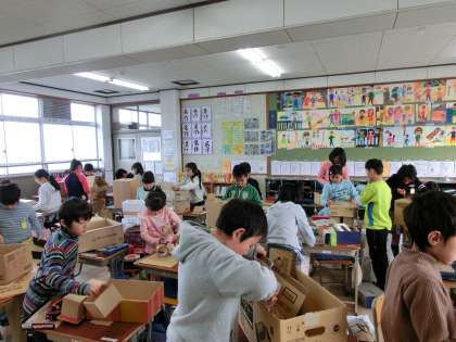 段ボールの箱を使って,自分の物を入れておくボックスを作ります。入れる物やおく場所を考えて,大きさ,形などを工夫しました。