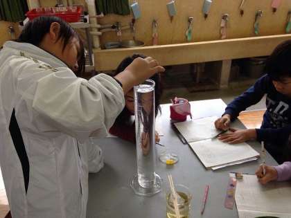 理科の学習で食塩やコーヒーシュガーが溶ける様子を観察しました。