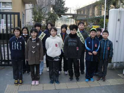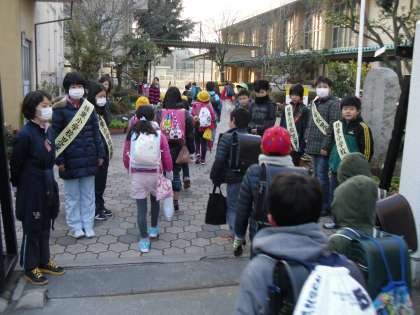 初日は高学年の代表委員さんです。寒さが厳しい季節になりましたが,集合に遅れる子もなく,しっかり声かけをしてくれました。