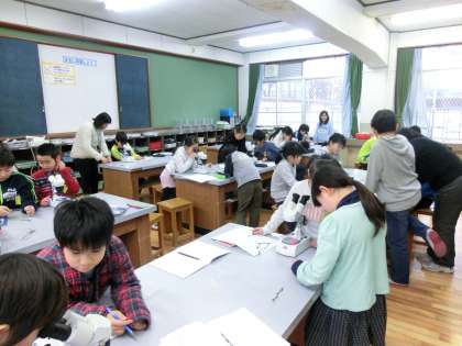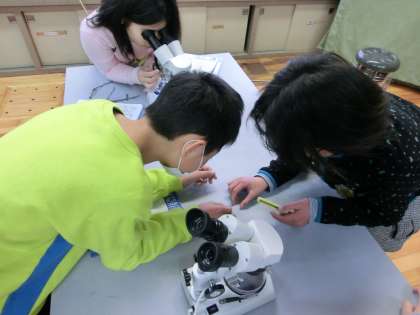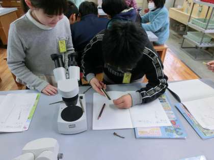 校庭のサクラは,寒さの中でも春の準備をしています。顕微鏡で冬芽(つぼみ)の観察をしました。
