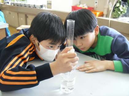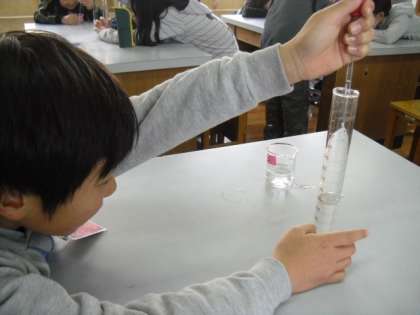メスシリンダーを使って50ミリリットルはかりとりました。みんな慎重にはかりとっていました。