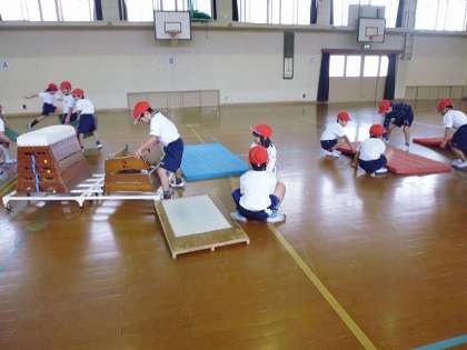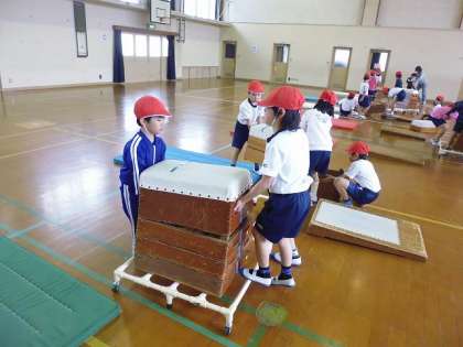 重たいとび箱やマットを,みんなで協力しながら片付けます。