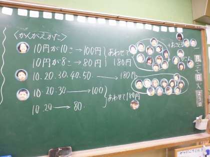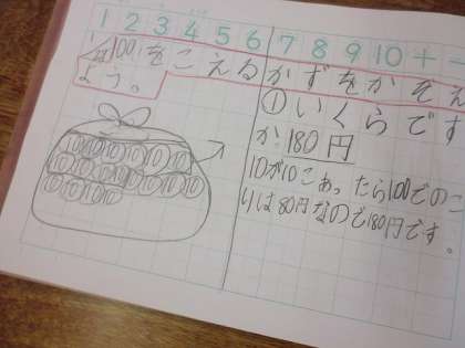 すると,10が10こで100を意識して考える人,10・20・30・・・と10とばしで数える人と,大きく分けて2通りでました。同じ問題でも,違う考え方があることが分かり楽しい時間になりました。