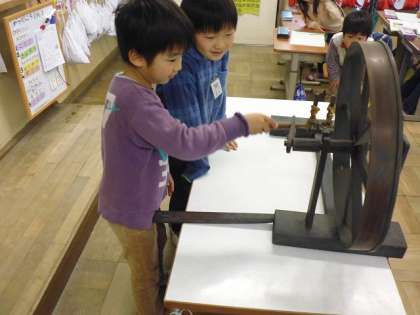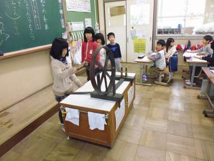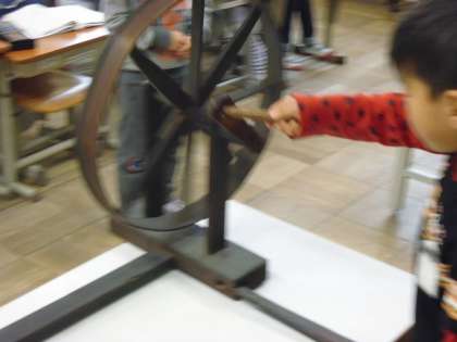 登場する人や動物,どんなことがおこったかを確認した後,感想を書きました。糸車も回してみました。「キーカラカラ・キークルクル」とは,なりませんでしたが,糸がどのように巻かれていくのかを感じることができました。