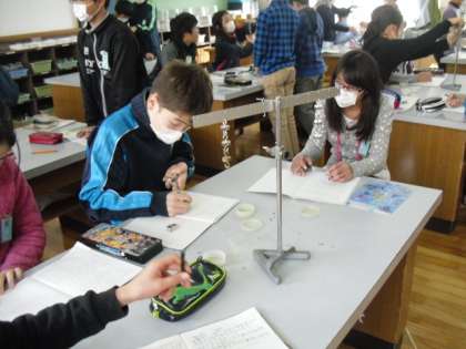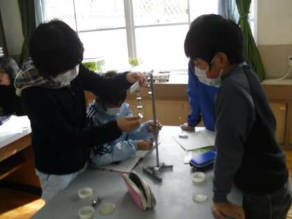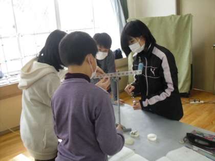 実験用てこを使って授業を行っています。実際におもりを使ってどこにどれだけおもりをつることでつりあうかを調べています。何か法則があるのかな?