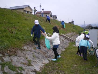 桂川の河川敷では,4年生が清掃活動を行いました。時折小雨が降り,とても寒い日となりましたが,子どもたちは細かなごみまでていねいに拾っていました。