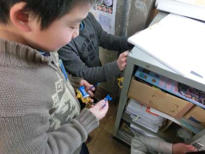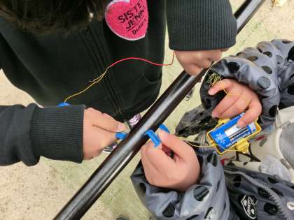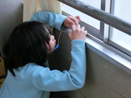 理科で「豆電球に明かりをつけよう」の学習をしていますが,今日は教室の中や運動場で簡易テスターを作って電気が流れるものを調べました。