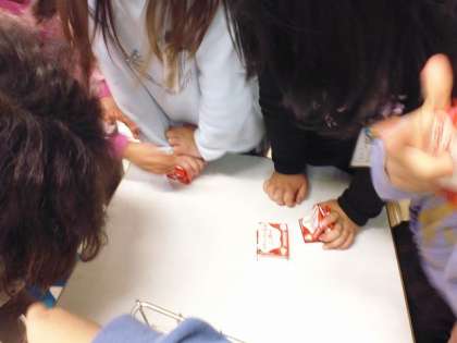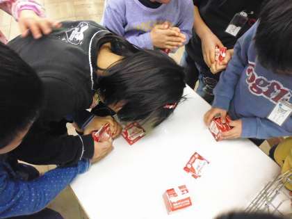 給食週間の取組で,牛乳パックの箱にたたんだパックがたくさん入るように頑張っています。今日は12個入れて破裂!みんなショックを受けていましたが、頑張りは見ていたよ!明日も頑張ってチャレンジしてみよう!