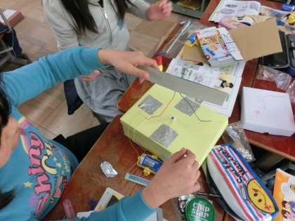 持ってきた箱やアルミホイル,わりばしやペットボトルなどを工夫して使い,工作を楽しんでいました。