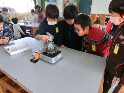 『すがたをかえる水』の学習も後半に近づいてきました。水が沸騰しているときに出てくる泡が水蒸気になり,袋の中に集め,温度が下がると水に戻るかを確かめました。子ども達は相変わらず,興味津々に実験を行いました。