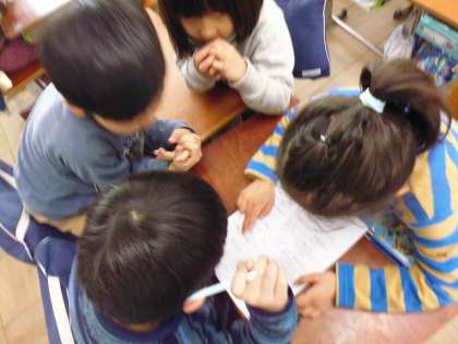 1年生は6年生と一緒に高学年のお兄さん・お姉さんが準備してくれている遊びを回っていきます。どれに行きたいか6年生に説明できるように,今日はグループで相談しました。とても楽しみですね!
