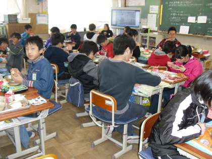 2組では,会社活動(係活動)のひとつで,週に1度いろいろなグループで給食を食べるということを企画してくれています。毎回,どんなグループになるのかみんな楽しみにしています。先週は,くじで決まった3人組。女2人に男1人のグループもあれば,その逆も。少々照れている子も(笑)次はどんなグループかな?