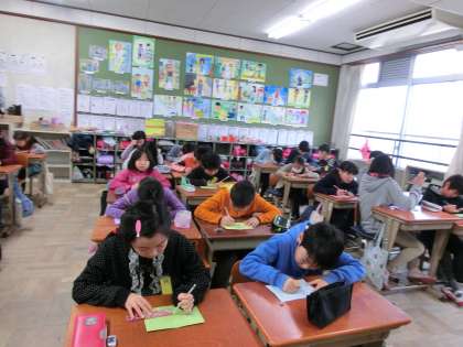 『すてきなペーパーショップ』の単元で色画用紙にいろいろな技法を用いて描いた模様で感謝の気持ちを込めて素敵なメッセージカードを書きました。