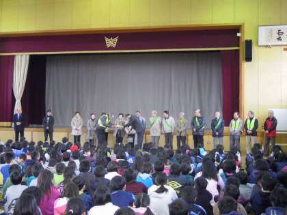 今朝の児童朝会後に引き続き,「見守り隊感謝式」を行いました。