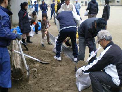 今年度は,消防署や地域の消防団,自治連合会の方々が中心となって,南門に以前から積まれている土嚢を新しいものに交換してくださいました。地域の方も参加して素早くていねいに次々と新しい土嚢が作られていきました。また,体育館では,心肺蘇生の訓練が行われました。皆さん真剣に取り組まれていました。