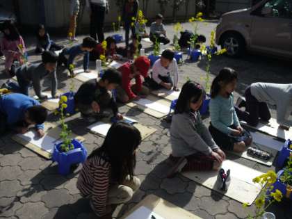 外はとってもいい天気。ぽかぽか陽気の中,菜の花に向き合いました。