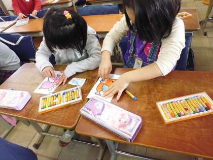 今日は,送る会で壁に飾る飾り作りをしました。カラフルな鳥たちが,模造紙いっぱいに飛び立っています。